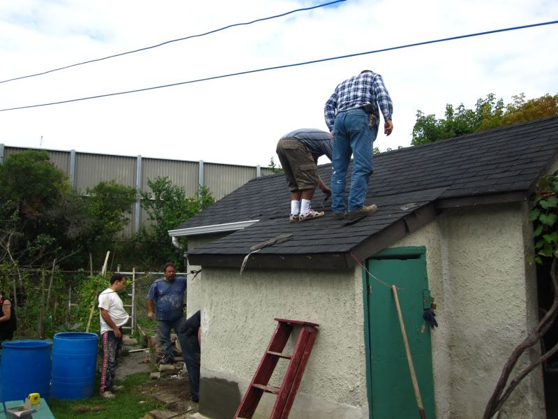 Today we headed over to Carm’s parents place to replace some shingles on a little shed attached to the garage. Carm had helped his dad to shingle over 40 years ago so there was a bit of experience, but mostly we were just going on what we’ve seen on TV. Luckily for us the guys that are patching the stucco were there to lend some experience. We would have managed without them – Carm and I work well together – but it was good to have their input for making the join between the old and the new. I think it turned out rather good!